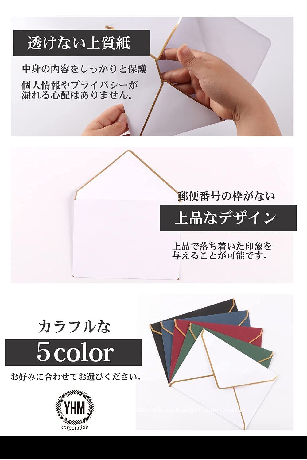 【 上品なレターセット 】「YHM corporation」製のレターセットは、肉厚な上質紙を使用しているため、中身の内容をしっかりと保護し、個人情報やプライバシーが漏れる心配はありません。また、郵便番号の枠がないため、受取人の方に対して上品で落ち着いた印象を与えることが可能です。色味もカラフルな5色のバリエーションでご用意しておりますのでお好みに合わせてお選びください