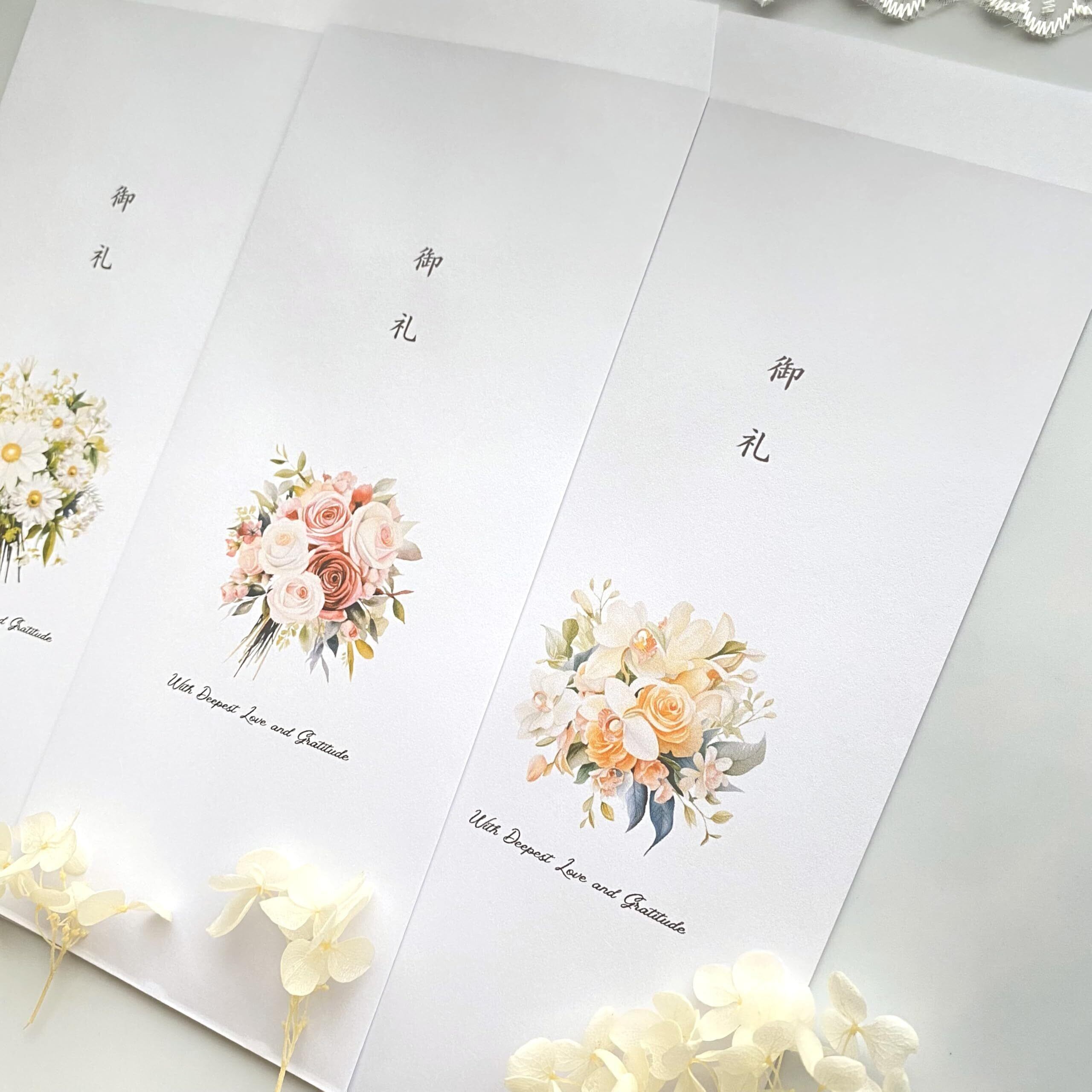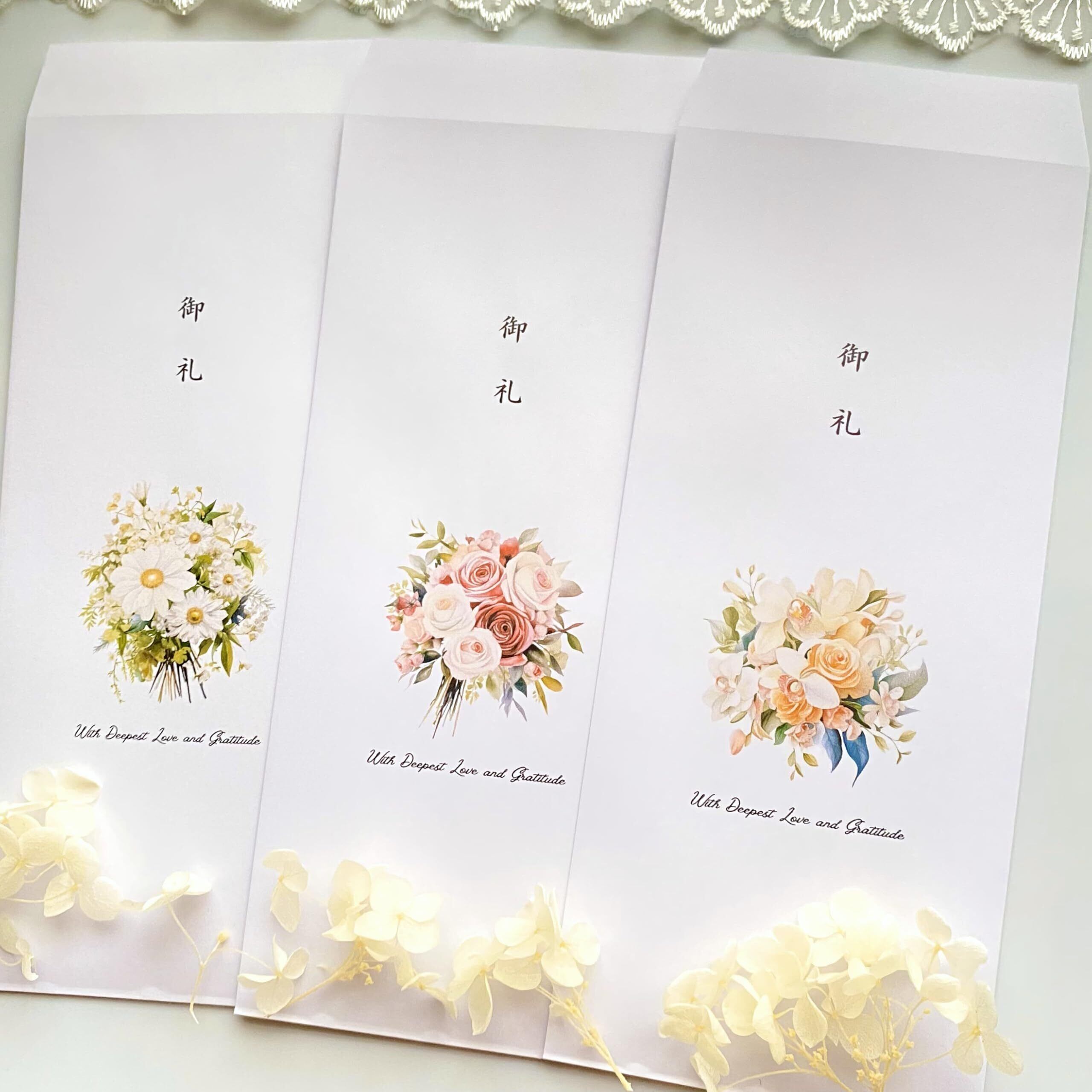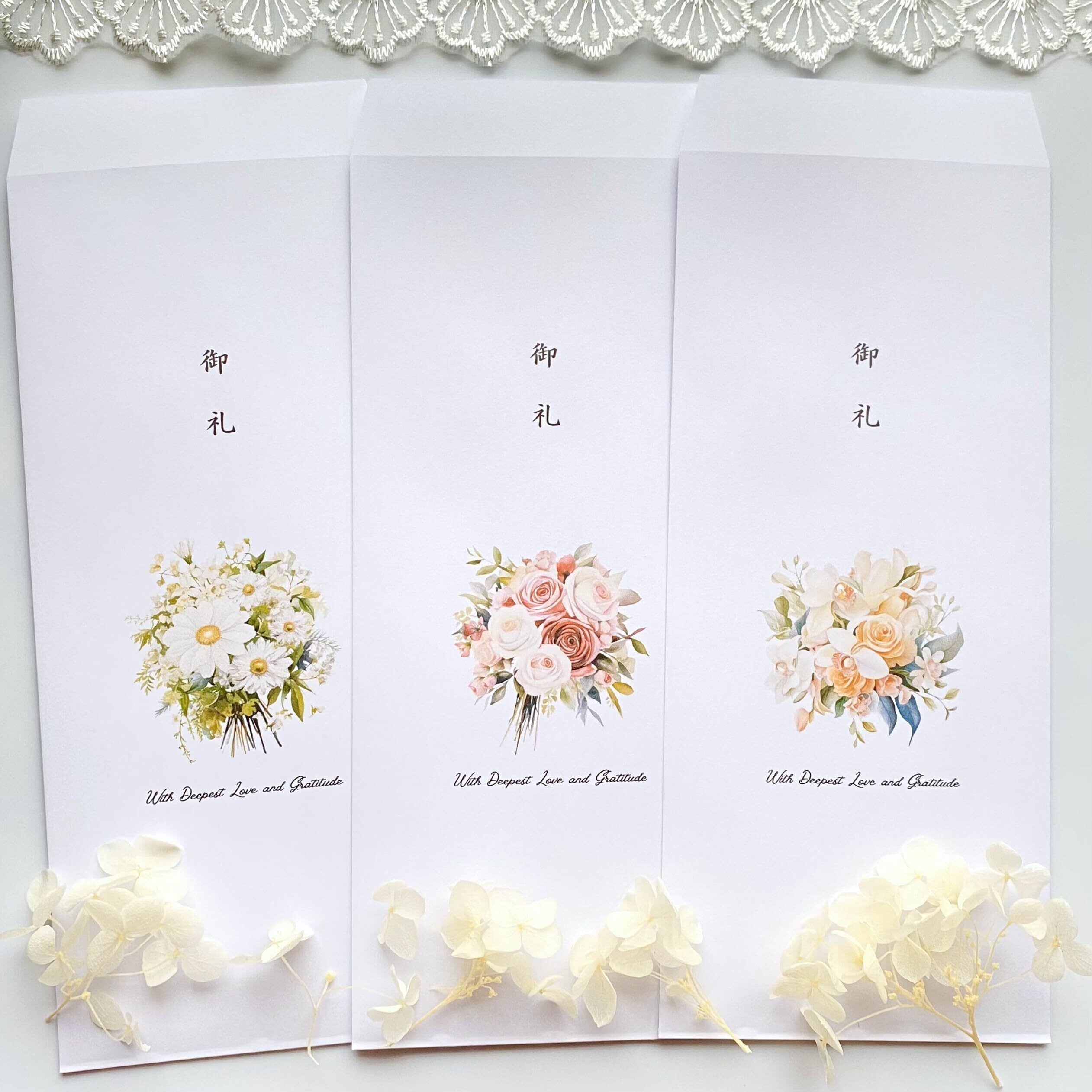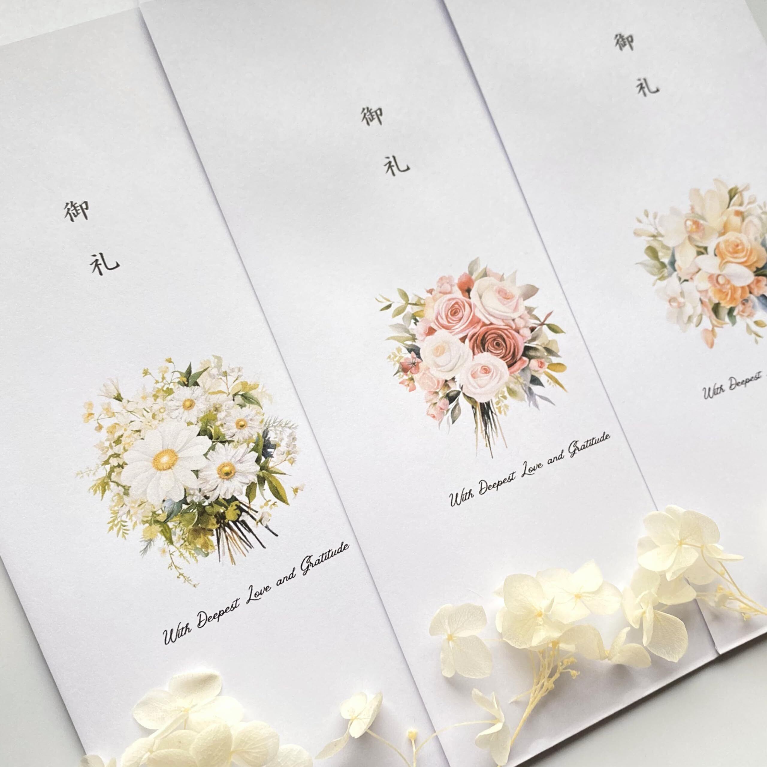 かわいらしい白いお花でまとめられたブーケ。品の良い花束が御礼の気持ちを伝えるのにピッタリな封筒です。お札を折らずに入るちょうど良いサイズ 裏側を止めるシールは、シンプルかつカラフルに彩りを与えてくれる、やわらかいカラーのシールを採用。 表も裏も上品に可愛らしく仕上がります。 封筒とシールのセットなので、サッと入れて渡せます。お忙しい方にもおすすめです。 配達時の折れ防止のため、型紙を入れて大切に発送いたします 10枚入り、20枚入りから必要な枚数をお選びいただけます。 他にも赤、白のブーケのイラスト商品をご用意しております。 ブーケの下には筆記体で「With Deepest Love and Gratitude(たくさんの愛と感謝を込めて)」と入っており、さりげなく感謝の気持ちが込められています。