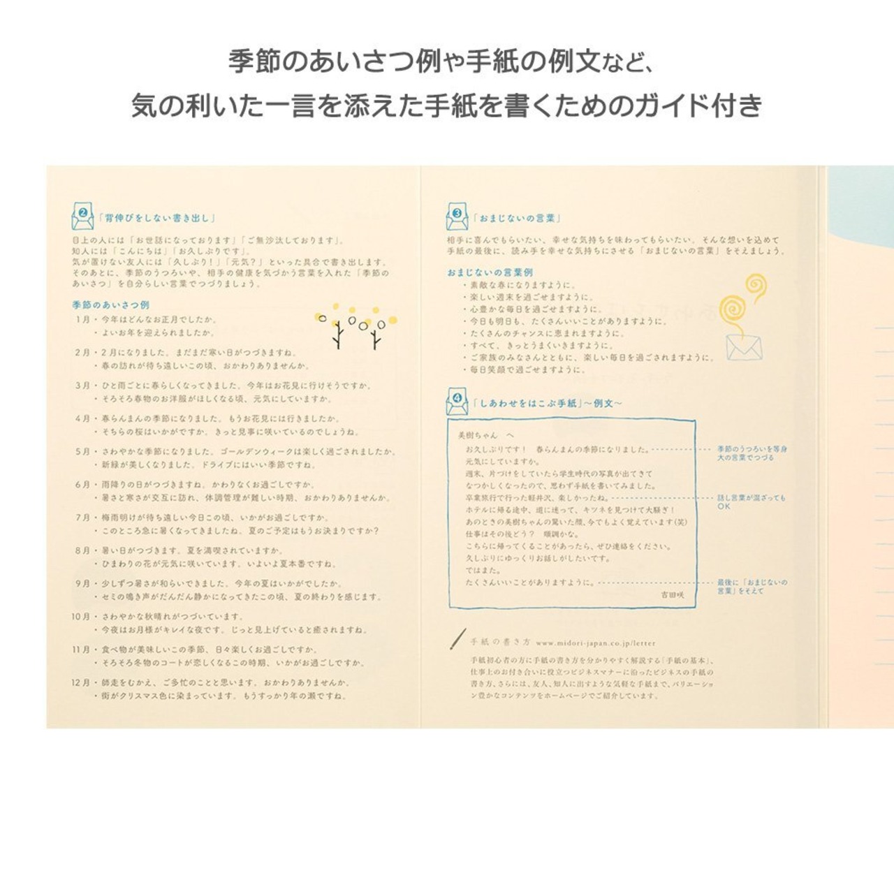 便箋には季節のあいさつ例や手紙の例文など、気の利いた一言を添えた手紙を書くためのガイドが付いています。