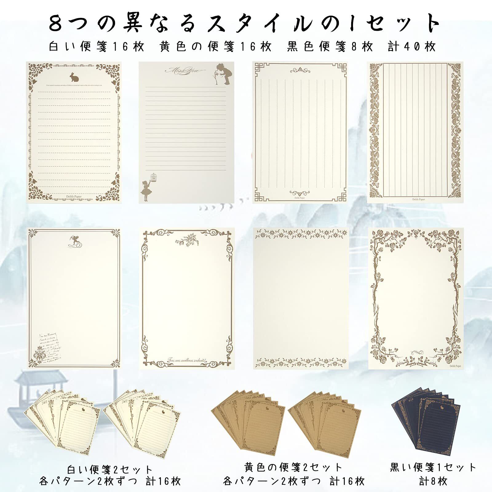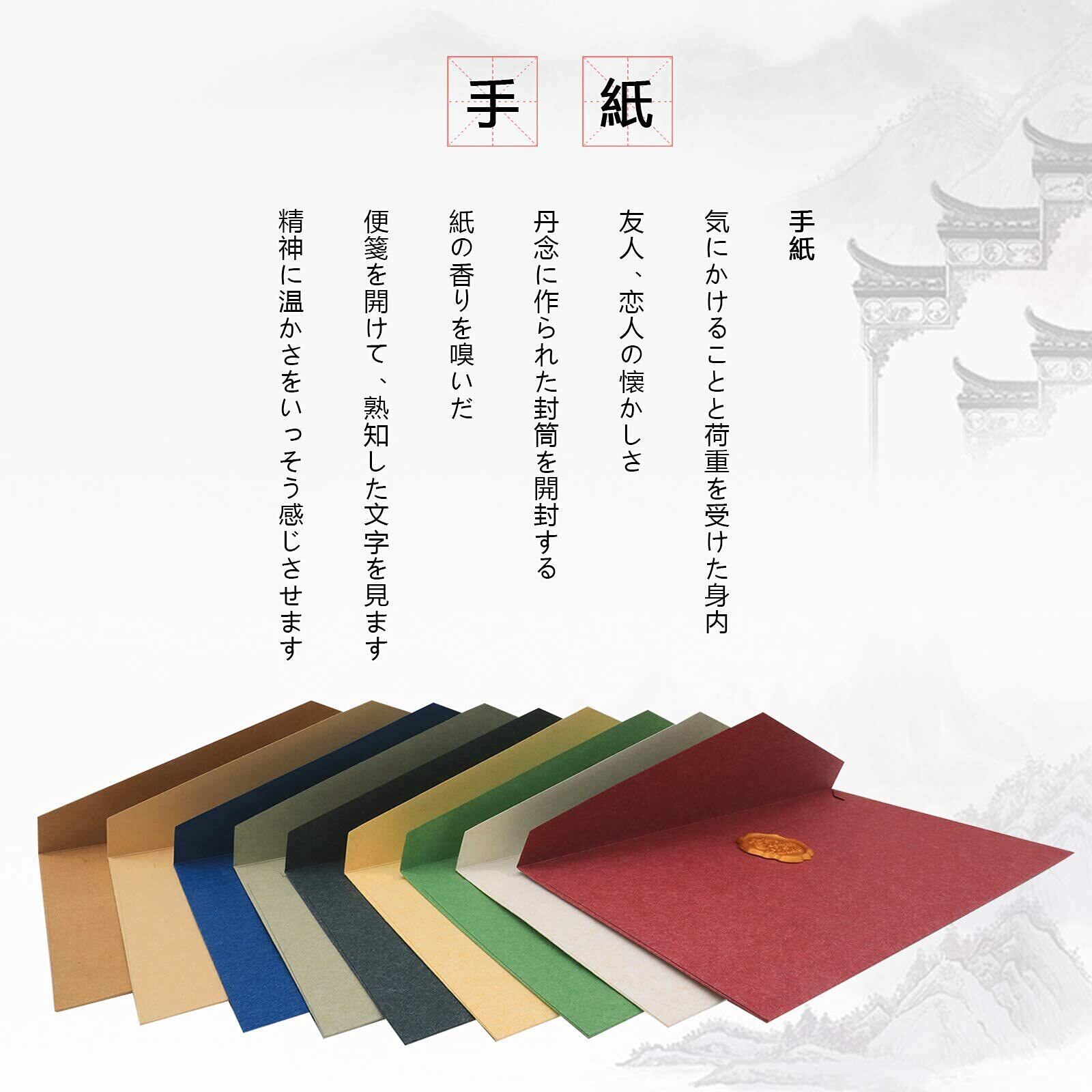 製品は含んで:30個の封筒(10種類の色、それぞれ種類の色のそれぞれの3個)、便箋40枚(1セット8枚の異なるデザインの便箋 : 白い便箋2セット、黄色の便箋2セット、黒の便箋1セット、計40枚)、38個の封筒飾り(人造バラ6個、封蝋8個、人造ベリー12個、人造オランダカイウ12個)、シール2枚(計32枚)、白いボールペン1本です;材質:封筒200GSM厚紙、手紙100GSM厚紙。