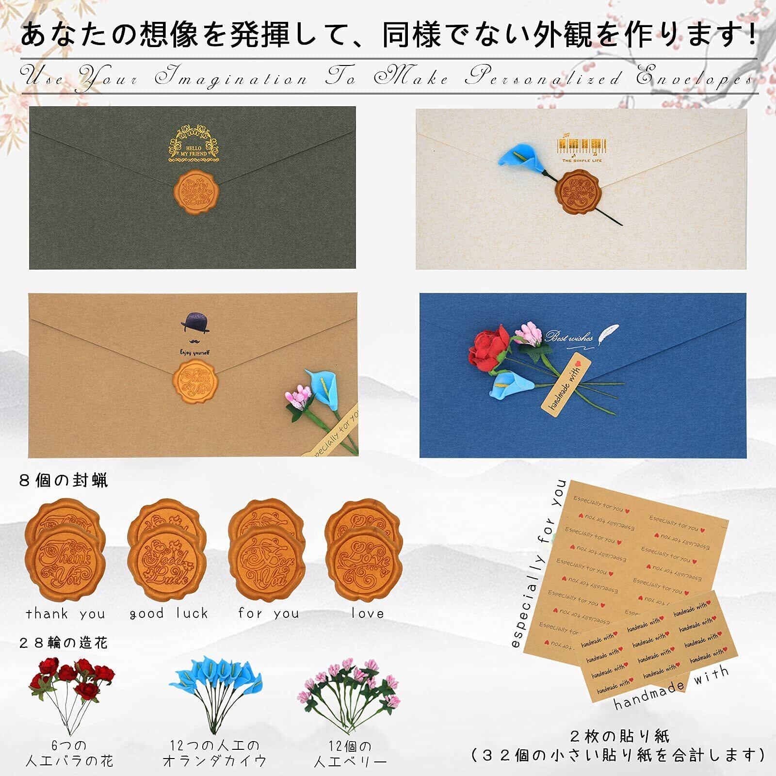 絶妙な封筒の装飾:さまざまなかわいい装飾シールを使用して、封筒にそれらを飾り、自由に組み合わせて、想像力を駆使して素敵で豪華な封筒を作成できます;私たちが提供する花、シーリングワックス、ステッカーを使って、あなたの大切な人への美しい手紙を手作りしてください。 相手がこの手紙を受け取った瞬間、忘れられないものになると想像してみてください。