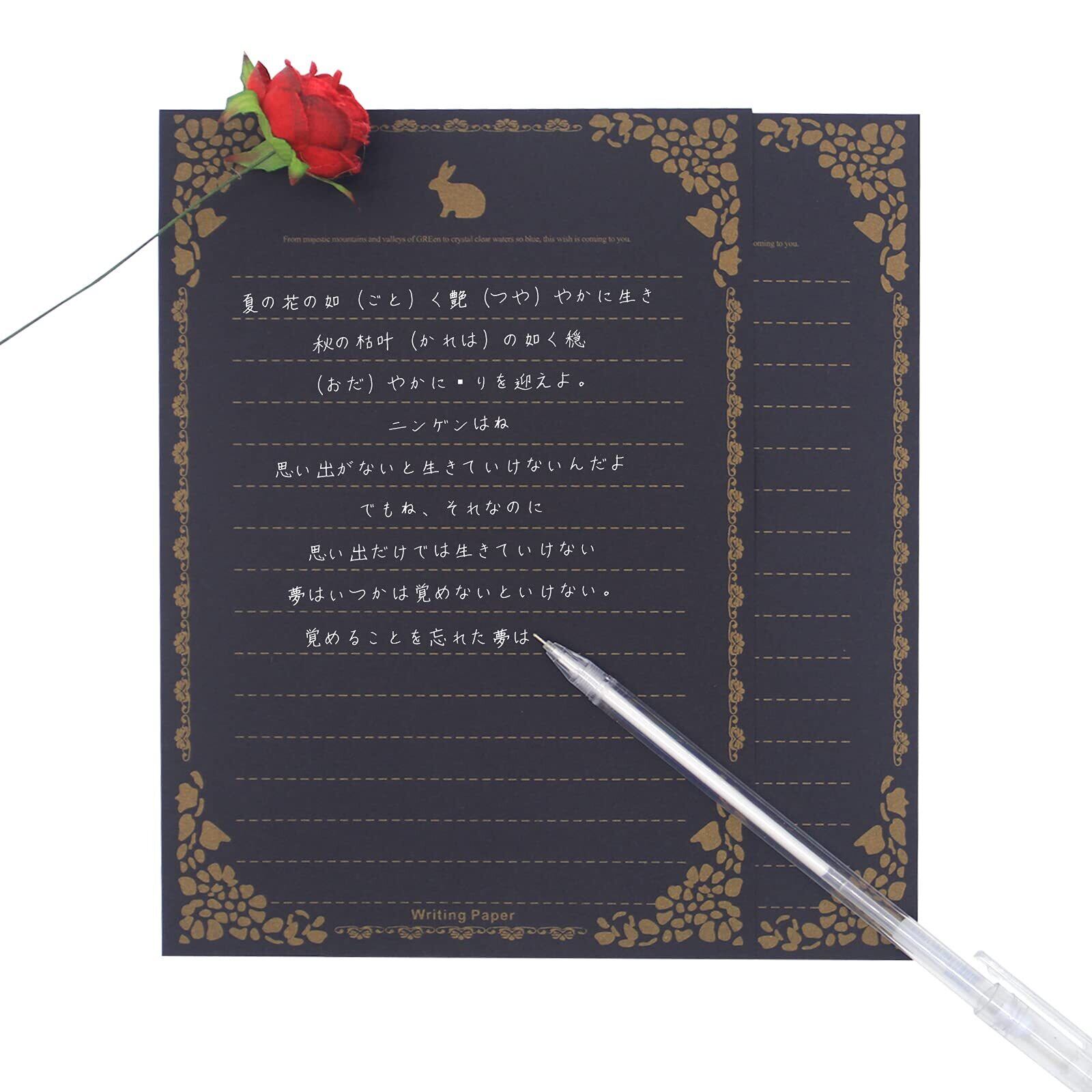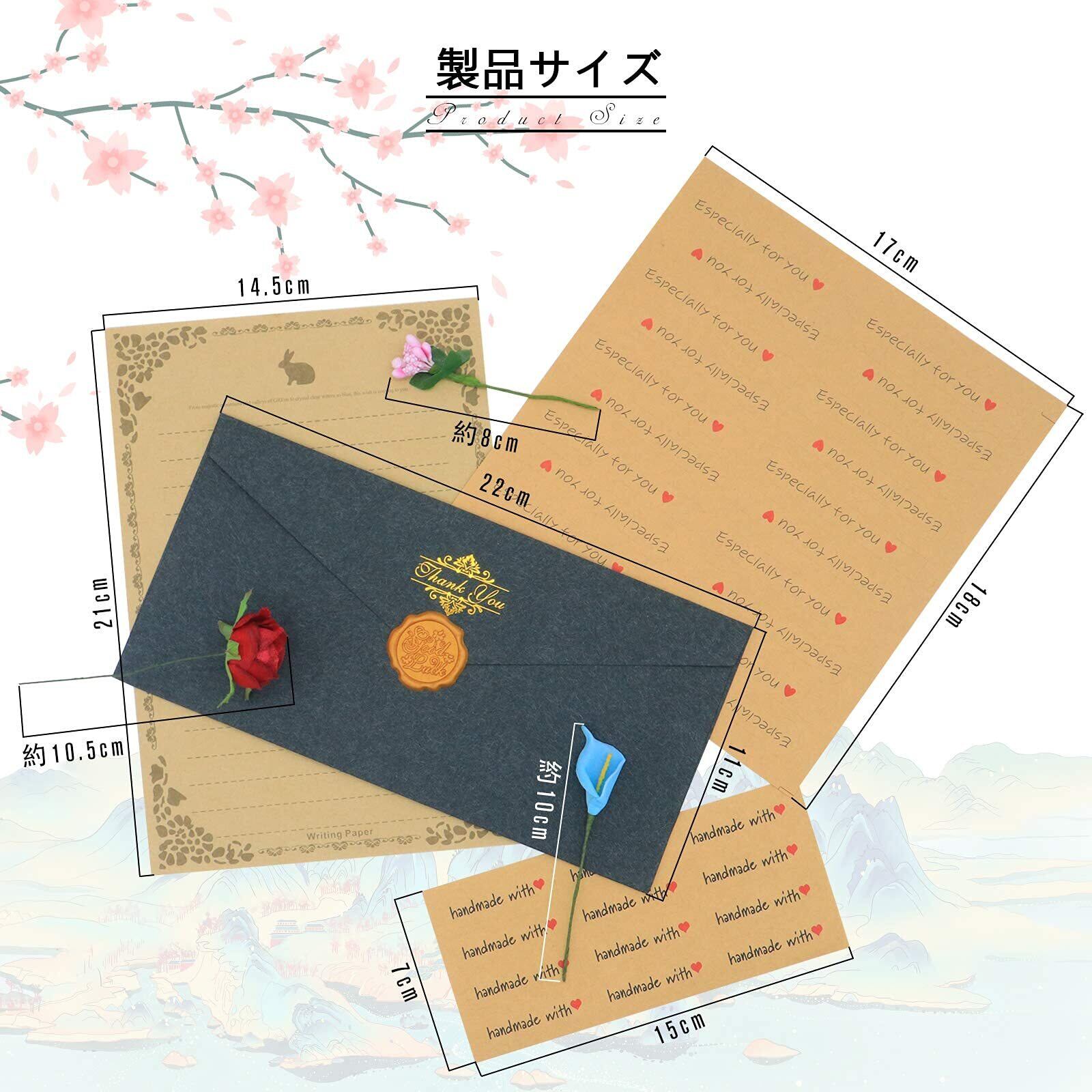 サイズ:封筒サイズ22 * 11cm; 便箋サイズ21 * 14.5cm; 蝋封サイズ約3.2cm; 花飾りサイズは約10-13cmです。 封筒とレター用紙の素材は200GSM厚紙です;黒い便箋に文字を書くのに便利な白いボールペンが1本入っています。