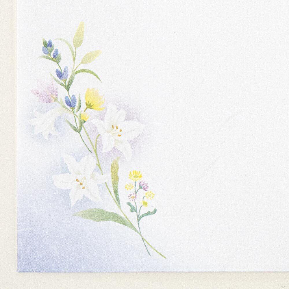 【商品仕様】便せんや封筒にデザインされた美しい百合の花が、寄り添う気持ちを表します。お悔やみの気持ちを伝える優しく上品な和紙の仕様です。