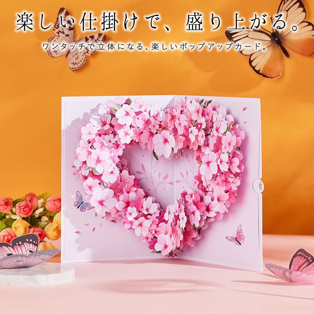 【数量限定】moin moin メッセージ カード グリーディングカード ポップアップ 桜 ピンク ハート リース (ミニカード + 封筒 セット) 花束 蝶 花 フラワー 立体 飛び出す 3D ギフト 誕生日 記念日 プレゼント 2410me349