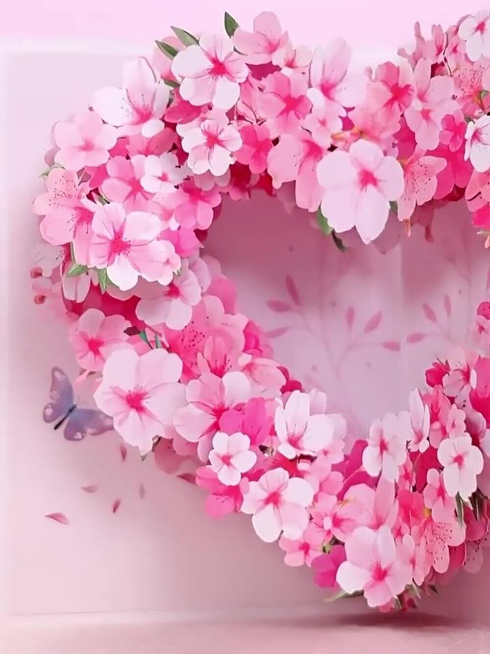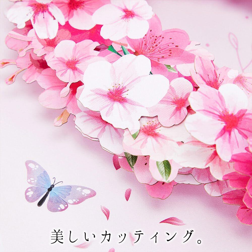 【 華やかな桜の花束リース 】 美しい桜の花びらがハート型にデザインされた、立体的なメッセージカードです。繊細な切り絵が施され、まるで本物の桜の花びらが舞い上がるかのようなデザインが特徴です。
