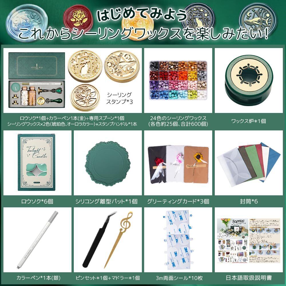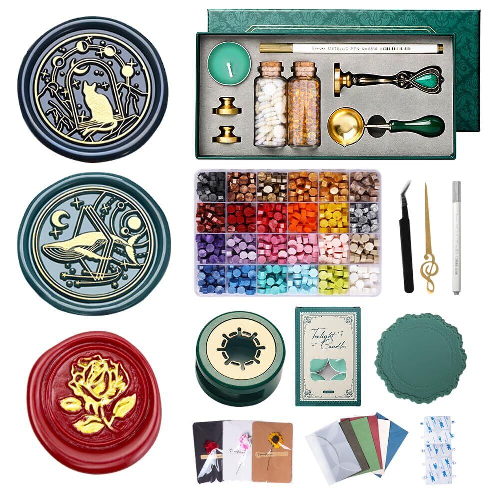 シーリングワックス スタンプセット シーリングスタンプ 封蝋 スタンプ プレゼント 招待状 結婚式 記念日 誕生日 祝い 手紙 印章 封書 ギフトボックス (All In Oneフルセット-2)