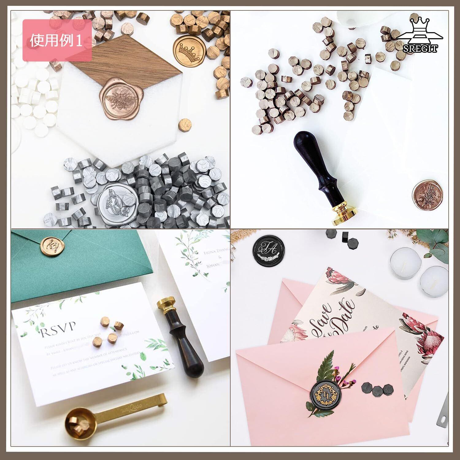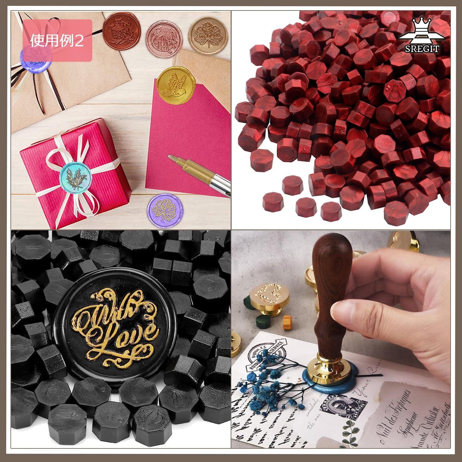 25mmスタンプには3~4粒のワックス、30mmスタンプには4~6粒のワックスをご使用ください。手紙の封蝋、招待状の作成、アルバム、カード作り、コラージュなど、シーリングスタンプ用ワックスとしてご利用いただけます。