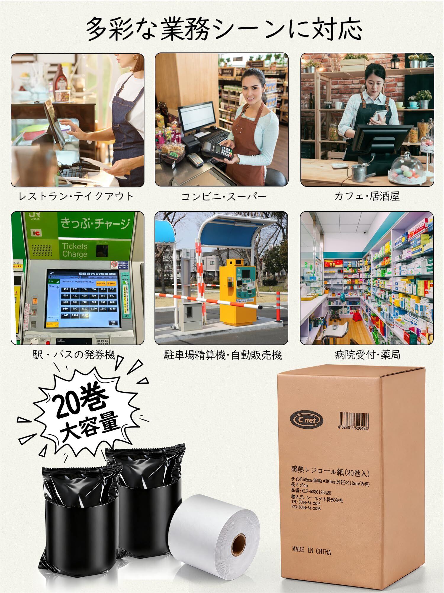 レシートロール紙 感熱ロール紙 58×80mm 20巻入 シーネット 幅58mm×80φ×内径12mm 長さ64m カシオ・シチズン・シャープ・東芝TEC対応【個包装 / 厚手75μ / ノーマル保存】レジスター・POS用