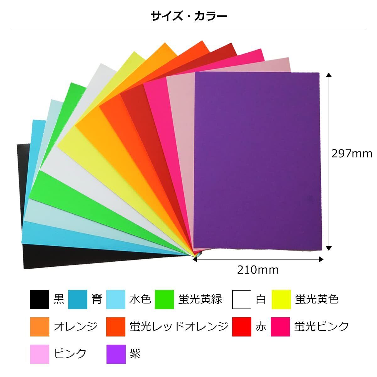 【仕様】 サイズ:A4(210×297mm) マット上質紙(黒のみ光沢紙) 背面シール仕様 カラー:黒・白・赤・蛍光ピンク・蛍光黄色・蛍光黄緑・蛍光レッドオレンジ・オレンジ・ピンク・水色・青・紫 各1枚 (12色) ※耐水性はありません。