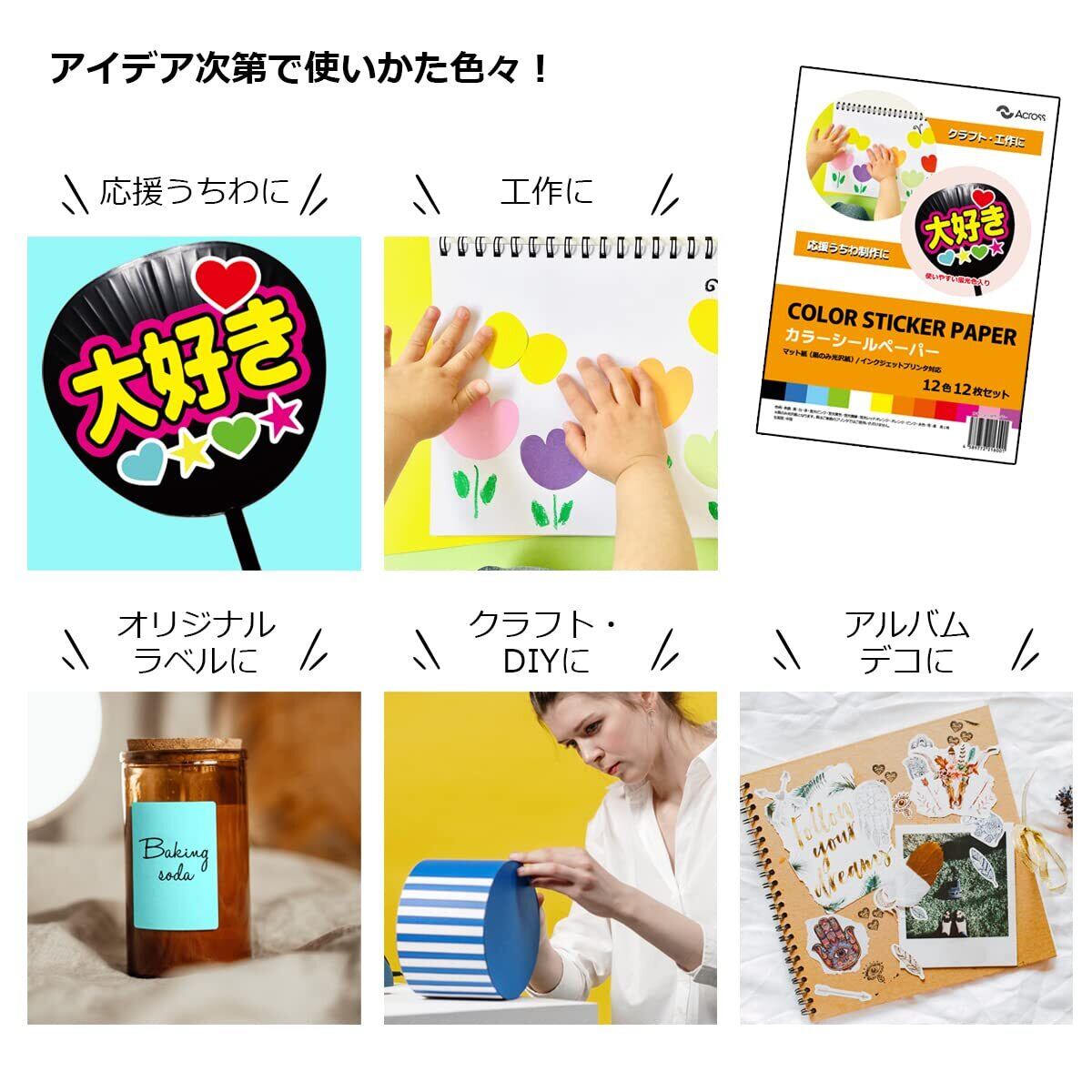 【特価セール】Across カラーシールペーパー 蛍光 12色 12枚セット A4 うちわ 応援うちわ シール カッティング シート カラフル 工作 (カラーシールペーパー)