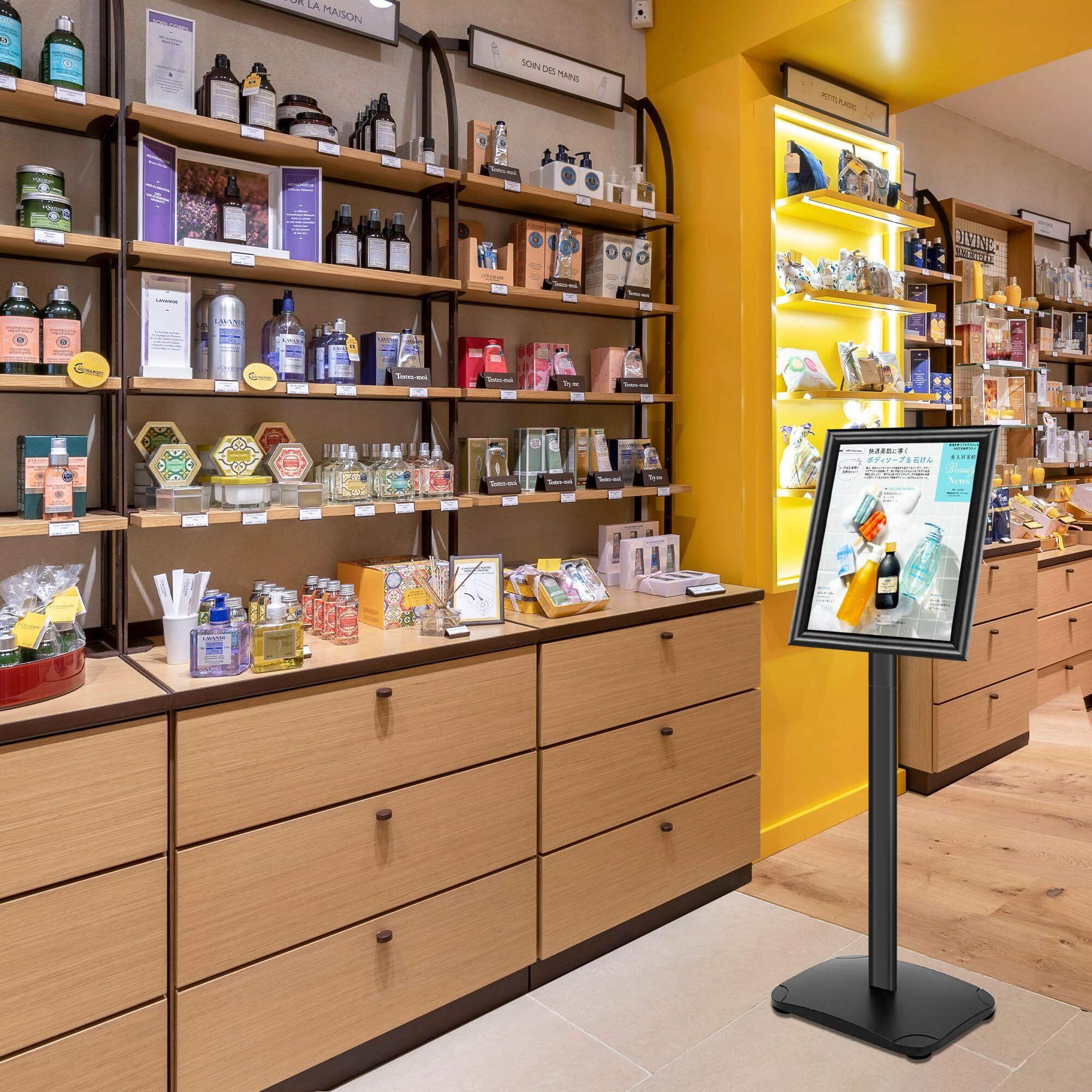 【A4ポスター対応・固定高さ設計】A3サイズ(29.7×42cm)専用設計で、縦置き約121cm/横置き約118cmの固定高さを採用。人目を引きやすい高さ設定で、案内や広告掲示に適しています。