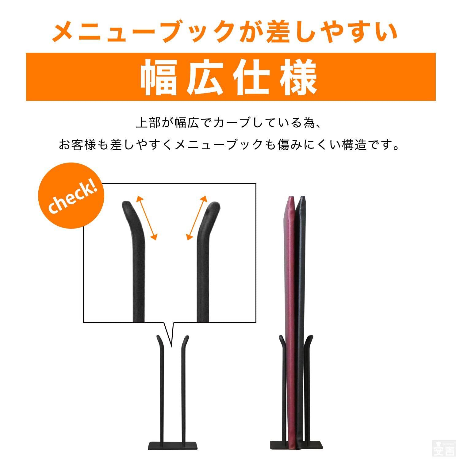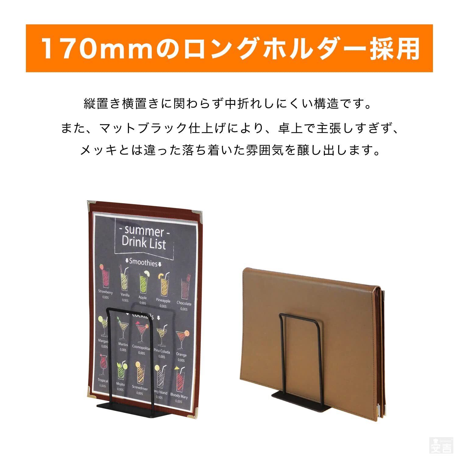 シンプルなブラックスチールのメニューブックスタンド。 卓上の雰囲気をスタイリッシュに演出するメニュー立てです。170mmのロングホルダー採用により、縦置き横置きに関わらず中折れしにくい構造です。 また、マットブラックの表面塗装により卓上で主張しすぎず、メッキとは違った落ち着いた雰囲気を醸し出します。