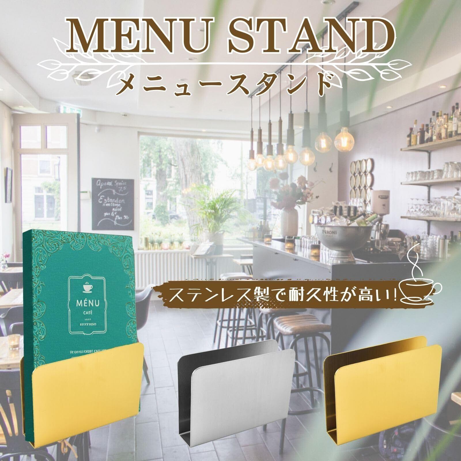 【キャッチーで魅力的なメニュースタンド】 メニュースタンドはステンレス製で耐久性が高く、飲食店やカフェのテーブルをスタイリッシュに演出します。卓上に置くだけでメニューが見やすくなり、お客様の注文もスムーズ。 おしゃれなゴールドとシルバーの2色展開で、店舗の雰囲気に合わせて選べます。コンパクトで場所を取らず、どんなテーブルにも馴染むデザインが魅力です。