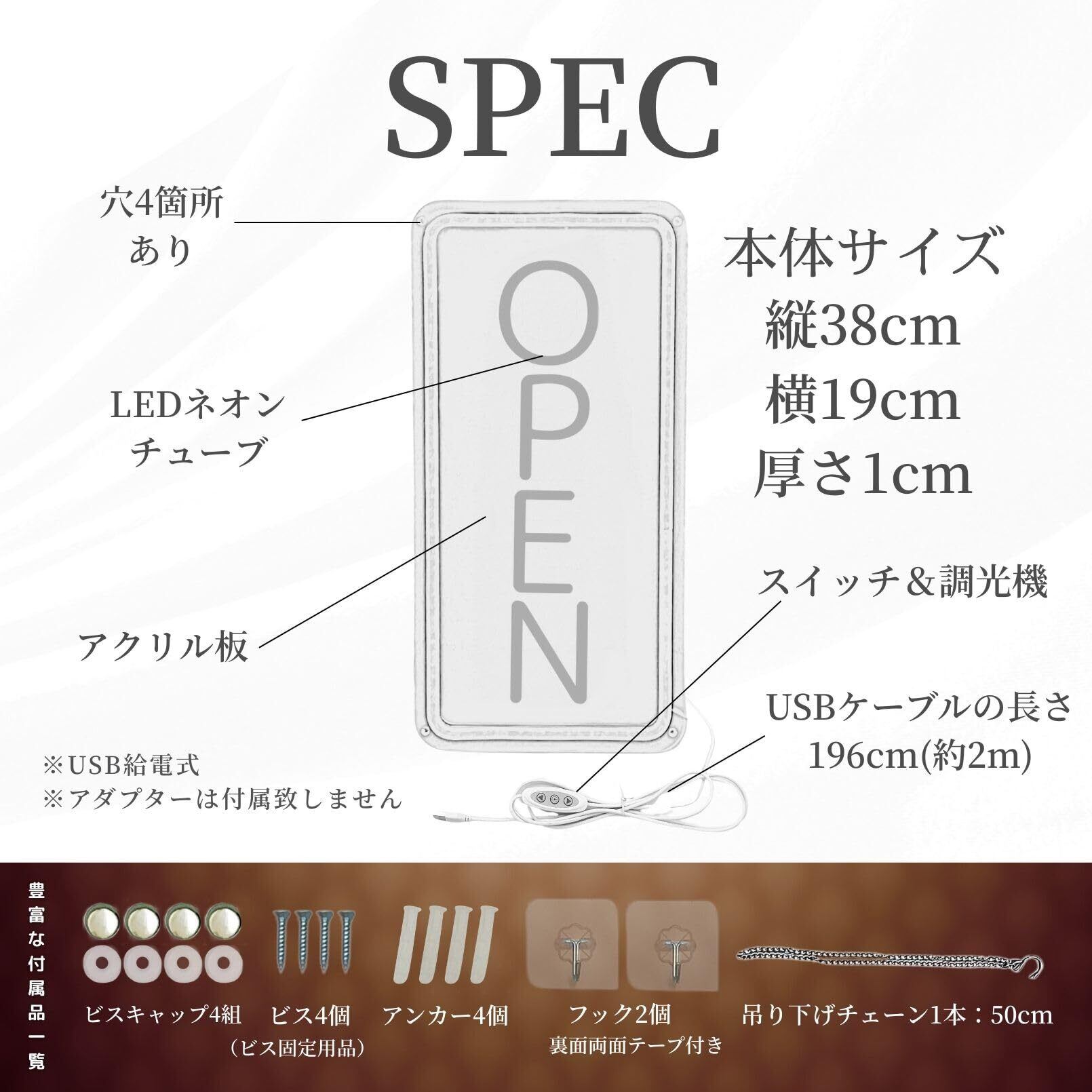 【梱包内容】OPENネオン看板 縦型×1 ビスキャップ×4 ビス×4 アンカー×4 フック×2 吊り下げチェーン×1 ※章氏は6枚目をご覧ください