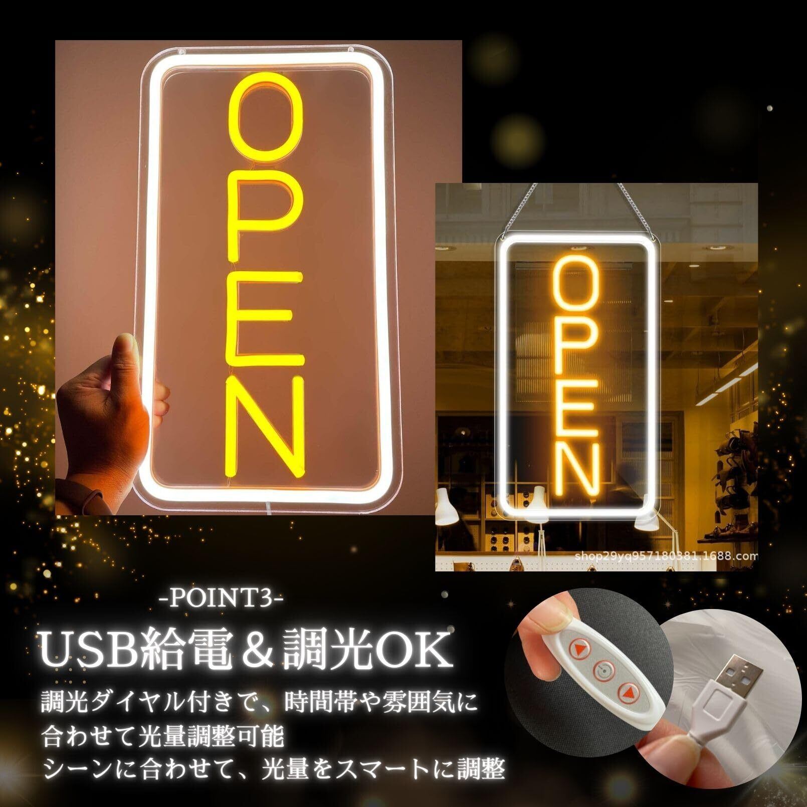 ️【集客力抜群】店舗の魅力を引き立てる縦型OPENネオンサイン この縦型OPENネオンサインは、飲食店、カフェ、バー、美容室など、さまざまな店舗の集客力を高めるための最適なアイテムです。鮮やかなLEDの光が遠くからでも視認性を確保し、通行人の目を引きます。特に夜間営業の店舗では、明るく目立つ看板として効果的です。おしゃれなデザインは、店舗の雰囲気を一層引き立て、インテリアとしても活躍します。USB給電方式により、電源の取り回しも簡単で、設置場所を選びません。壁掛けや吊り下げなど、柔軟な設置方法で、店舗のレイアウトに合わせてご利用いただけます。