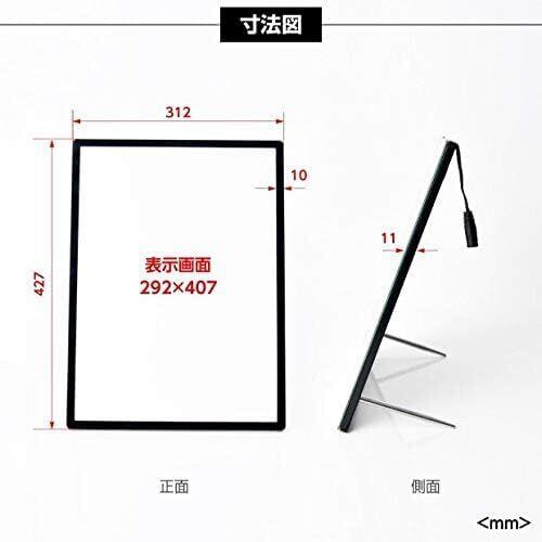 看板仕様:本体サイズ 312mm×427mm 原稿サイズ A3/ 297mm×420m 表示画面 292mm×407mm 表面照度 4500LUX 付属品 壁掛け用金具セット×2<br>卓上用ビス×2<br>電源コード:長さ2m (本体より)