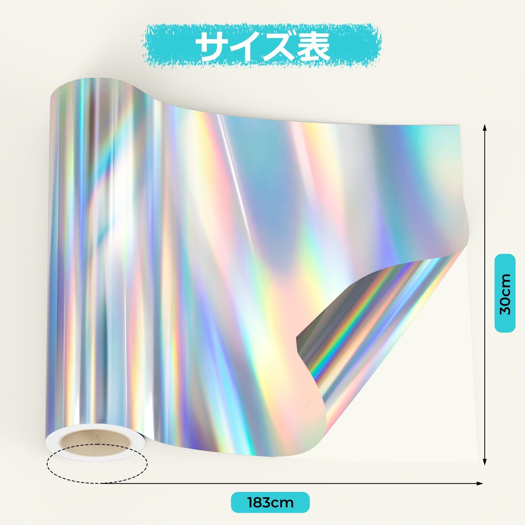 【商品仕様】艶のあるホログラムシートです。サイズ:30cm×183cm(A4サイズ約9枚分)。ブラザー、シルエット、Cricutなどのカッティングマシンに対応します。使用前にテストカットをお試しください。