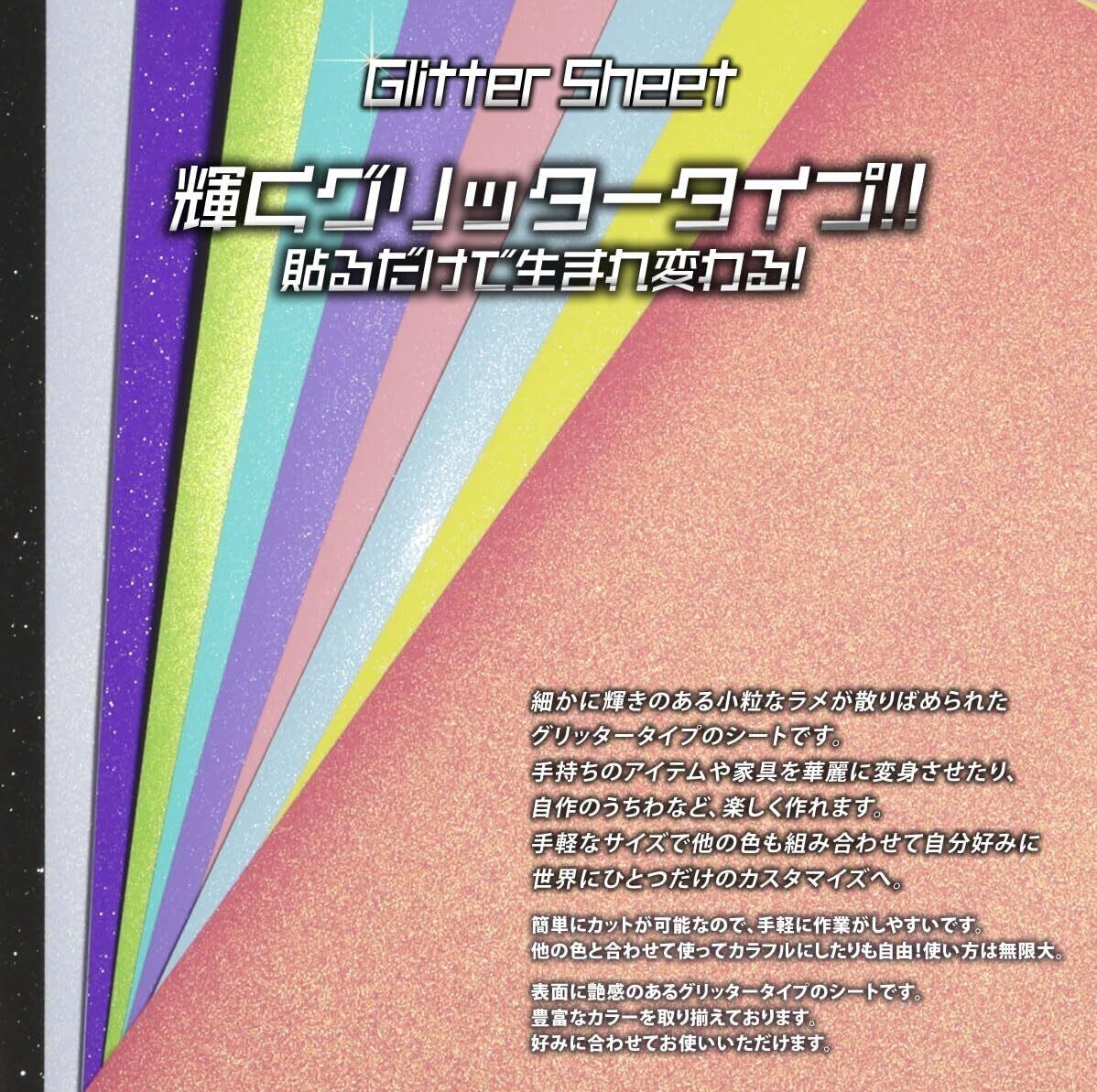 輝くグリッタータイプ。貼るだけで生まれ変わる!輝きのあるグリッタータイプのシートです。小粒ラメが散りばめられている美しい輝きが魅力です。小粒ラメの為、光の当たらないところでは、ラメの反射が弱い為、電気や太陽下など光のある所でキラキラと光りをお楽しみください。手持ちのアイテムや家具を華麗に変身させたり、自作のうちわなど、楽しく作れます。手軽なサイズで他の色も組み合わせて自分好みに世界にひとつだけのカスタマイズへ。柔らかく貼りやすい。