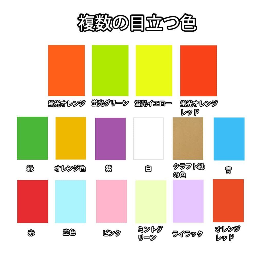 【仕様】サイズ:A4(210×297 MM) カラー:16色4種類の蛍光プラス(蛍光グリーン、蛍光イエロー、蛍光オレンジ、蛍光オレンジレッド)+12種類の通常色(緑、オレンジ色、赤、青、白、クラフト紙の色、紫、 ライラック、空色、オレンジレッド、ミントグリーン、ピンク)※耐水性はありません。