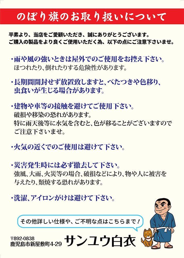 【仕立】:ほつれ止め加工済(三方三巻縫製) 右チチ(上側3カ所、右側5カ所) (のぼり旗を屋外で使用する場合、切りっぱなしのヒートカット仕上げだと、風の影響を受け辺がほつれやすいようです。 対策としまして、上、下、ポールの反対側の辺を折り返して縫い込んであります「三方三巻縫製」。少し、丈夫になり、長持ちします。)