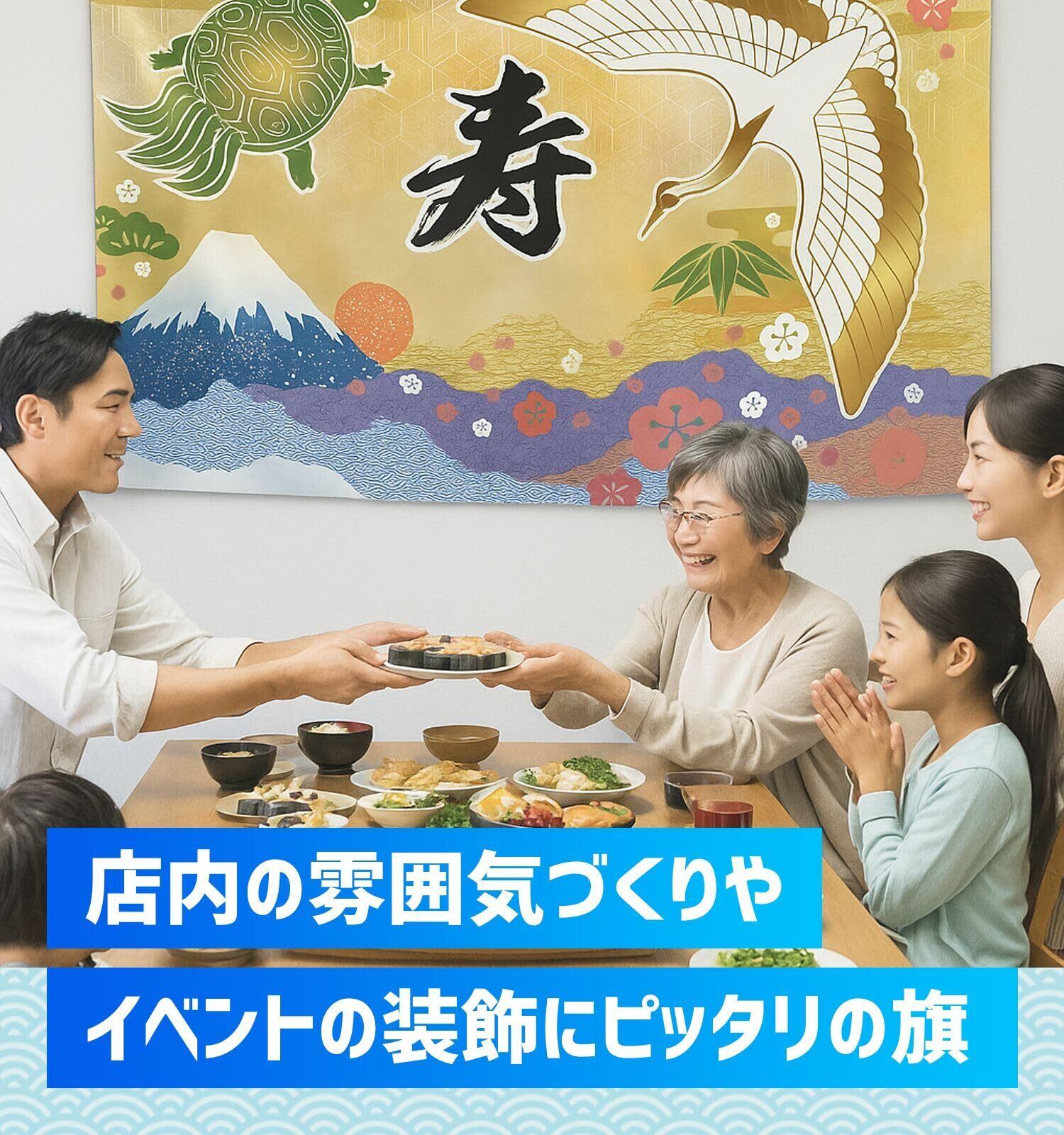 【祝いの席に映える縁起物】商売繁盛、新築祝い、出産祝いや、米寿や喜寿のお祝いなど、特別な節目を華やかに演出。大漁旗の鮮やかな色彩とモチーフが祝福の気持ちを引き立てます。