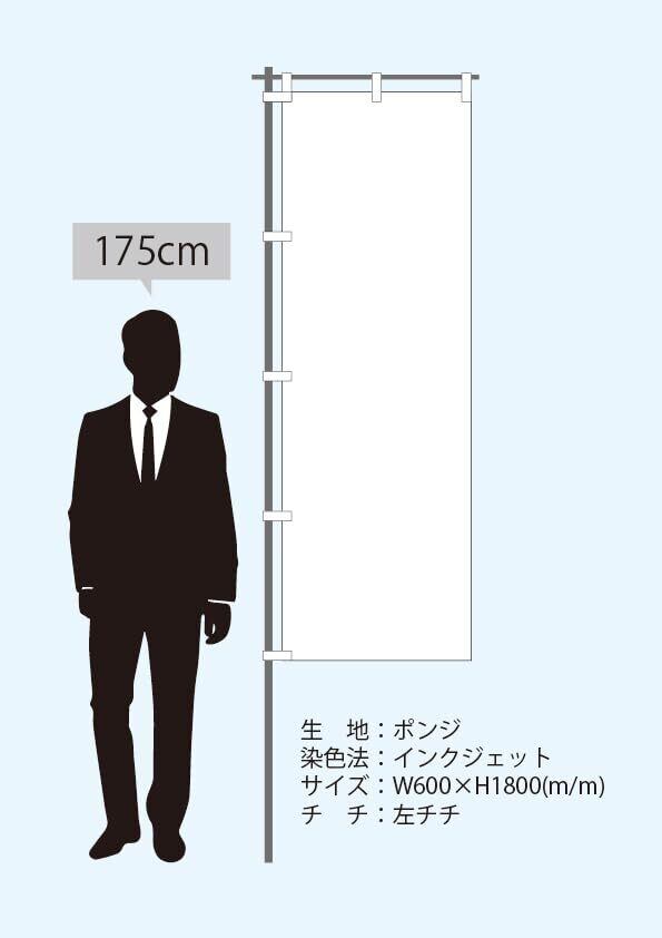 サイズ:約W60×H180cm 生地:ポンジ※非防炎 加工:周囲ヒートカット チチ:上3左5 ■商品は折りたたんで発送させていただきます。タタミしわがつきますのでご了承くださいませ。 ■印刷方法により、商品サイズに対して数%程度伸縮する場合がございます。 ■商品はのぼり旗のみです。 注水台、ポールは付いておりませんのでご注意ください。 ■お使いの環境(モニター、ブラウザ等)の違いにより色の見え方が実物と異なる場合がございます、予めご了承ください。