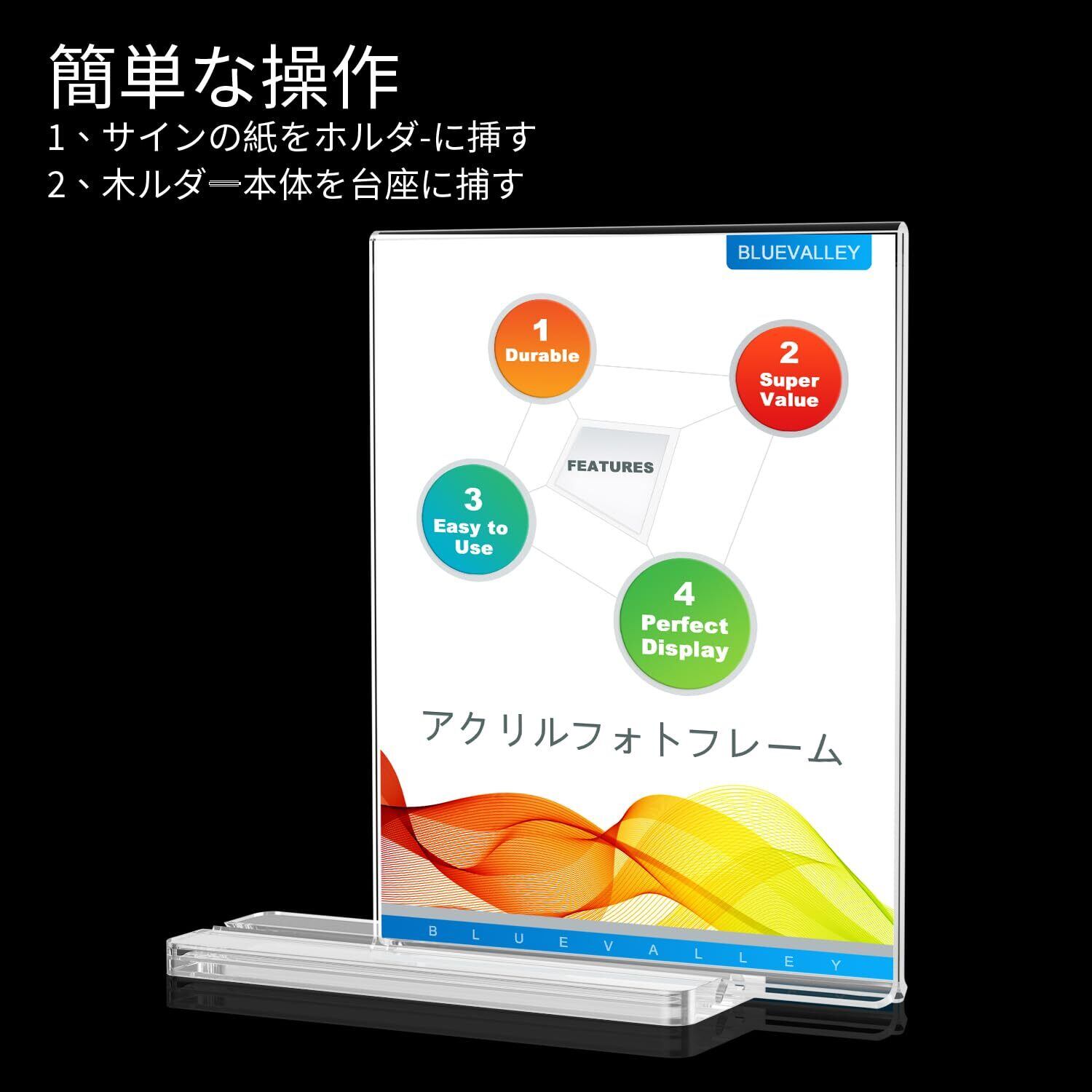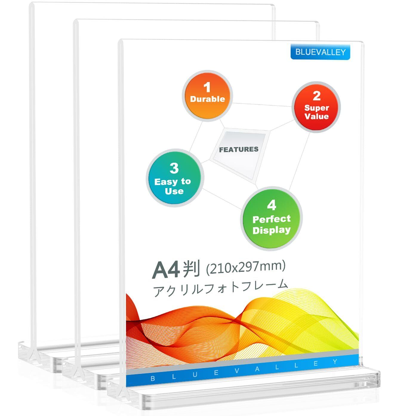 BlueValley アクリルフォトフレーム メニュースタンド A4判 縦置き 両面用 サインスタンド 写真立て おしゃれ ポップスタンド - 展示会・イベントのPOP広告、飲食店のメニュー、家族のポスター、オフィスもの紙用 卓上展示 透明 (210×297mm) - T字型3本セット