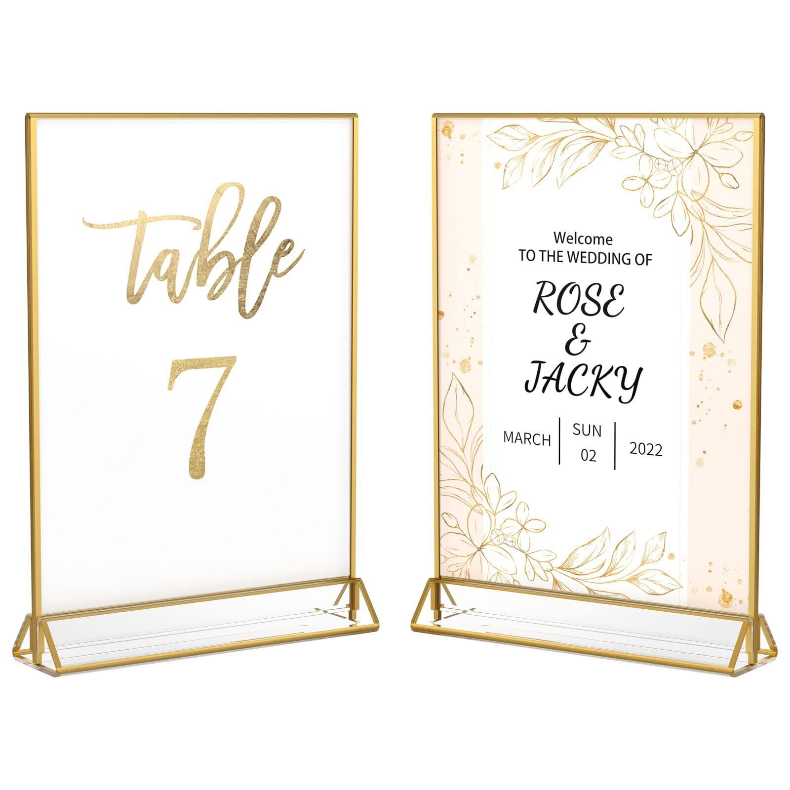 【数量限定】NIUBEE アクリル サインホルダー ゴールドフレーム 両面用 透明 縦置き【サイズ:A4判 6本セット】 垂直スタンド付き、結婚式のテーブル番号の表示、広告写真、カード立て、メニューディスプレイに最適 (ゴールド縁,210x297mm)