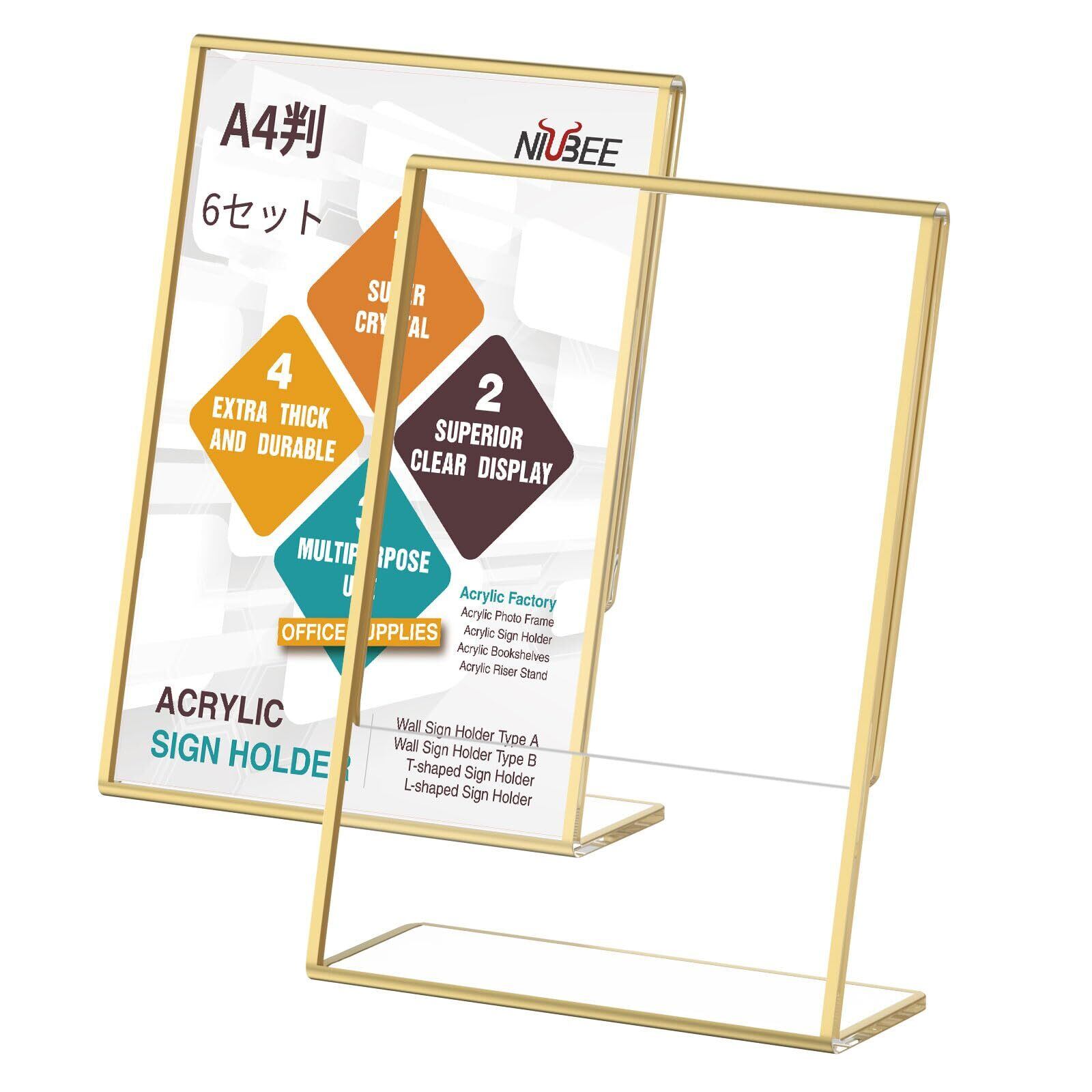 【数量限定】NIUBEE ゴールド縁サインホルダー 【6セット】A4判 L型縦置き サインスタンド POPスタンド アクリル スタンド ポップスタンド カード立て 両面 案内 広告 卓上 写真立て 広い場面に適用ポスタースタンド…