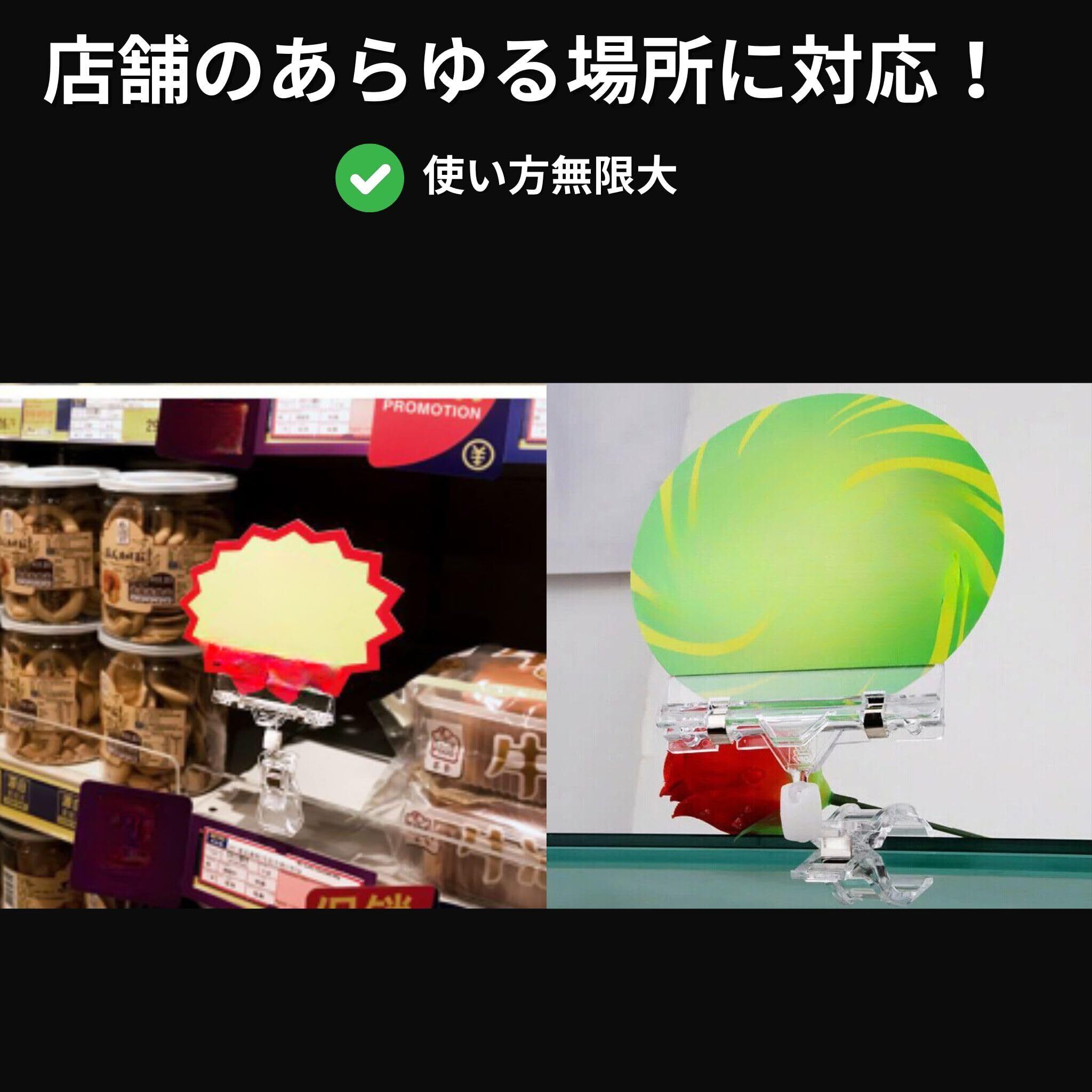 (360度角度調整が可能)このポップクリップは360度の首振りタイプで、設置場所を選ばずどんな角度でも調整可能。目立ちにくい隅の商品や、視認性を高めたい場所にも最適です。簡単に設置でき、安定してポップを取り付けることができます。