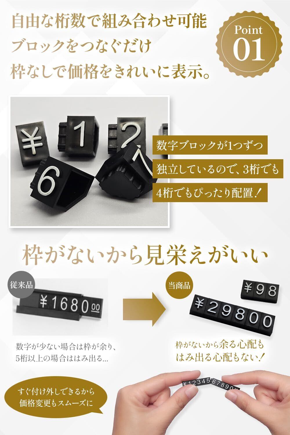 【自在な組み合わせでスマートに表示】ブロック状の数字をつなげるだけで、価格表示を簡単に作成できます。数字の配置がスムーズで、どんな桁数でもきれいに見せる価格表示ツールです。つなぎ目が左に来るように改良済みで見た目にこだわりました。