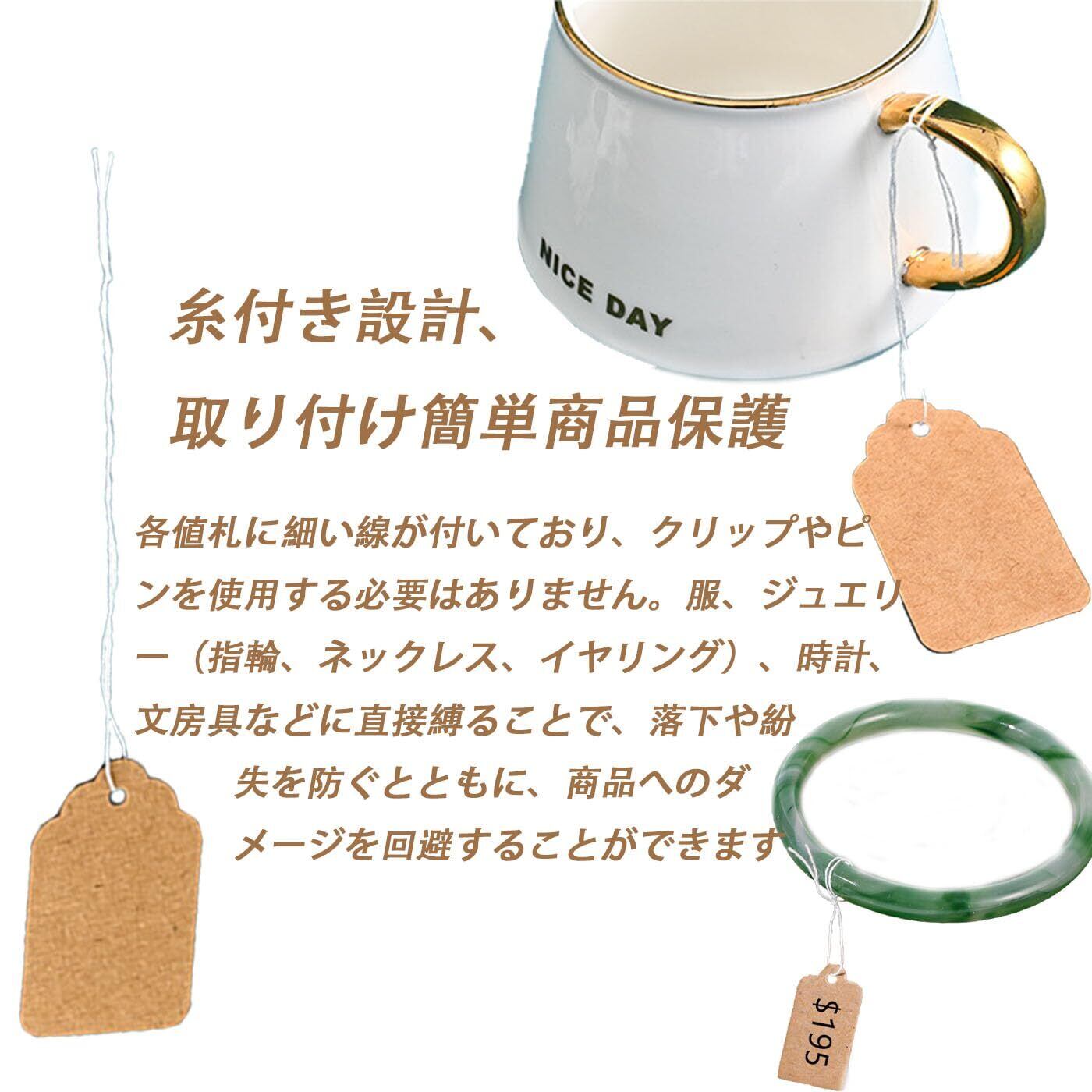 糸付き設計、取り付け簡単商品保護:各値札に細い線が付いており、クリップやピンを使用する必要はありません。服、ジュエリー(指輪、ネックレス、イヤリング)、時計、文房具などに直接縛ることで、落下や紛失を防ぐとともに、商品へのダメージを回避することができます