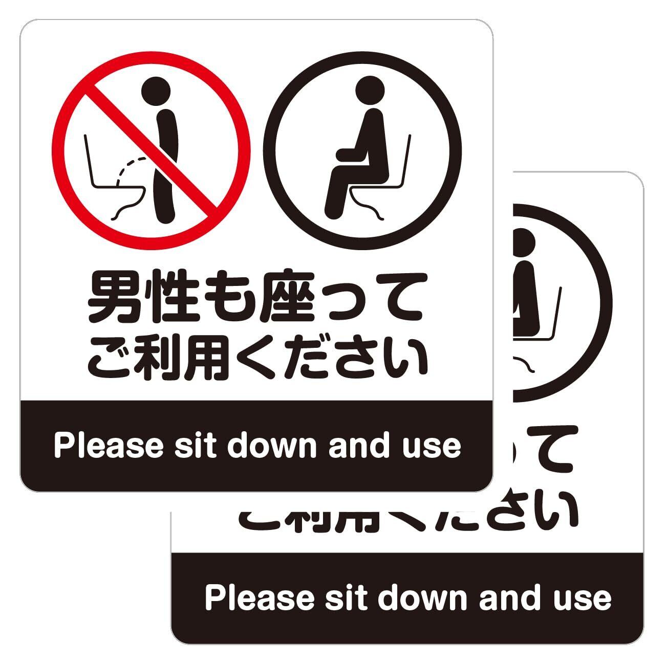 清潔で快適なトイレ空間づくりをサポート! 男性にも“座って使用”を促す、わかりやすいデザインのトイレマナーステッカーです。 視覚的に伝わるピクトグラムデザイン 「立ちション禁止」「座って使用」をイラストで明確に表現。言葉が通じなくても伝わりやすく、公共施設やご家庭でも活躍します。 2枚で1セット! 便座のフタが閉じていても、開いていても対応可能。どちらにも貼れるので視認性も抜群です。 水まわりでも安心の耐水・耐久素材 水に強い素材を使用しているため、長期間しっかり貼り付きます。掃除の際もさっと拭くだけでOK。 日本語&英語表記 海外の方にも配慮し、「Please sit down and use」の英文入り。多言語環境にも対応します。