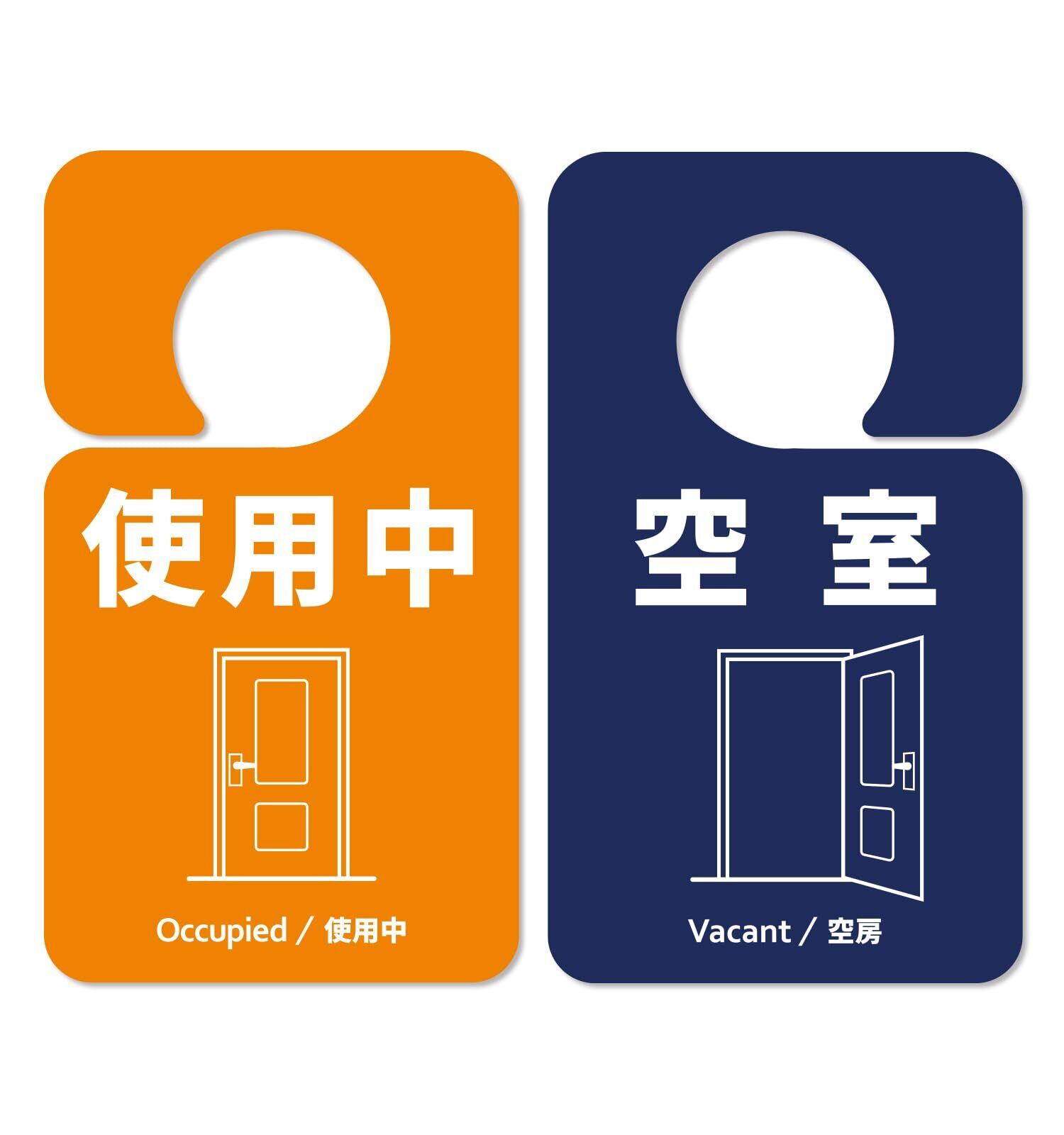 【新春セール】ドアプレート 両面表示 21×12cm 使用中/空室 1枚入 オレンジ&ネイビー アイコン 吊り下げ ドアサイン 案内 トイレ 更衣室 浴室 オフィス 学校 おしゃれ NYANDELMO ND-0411-R01-doorplate-occupied-1