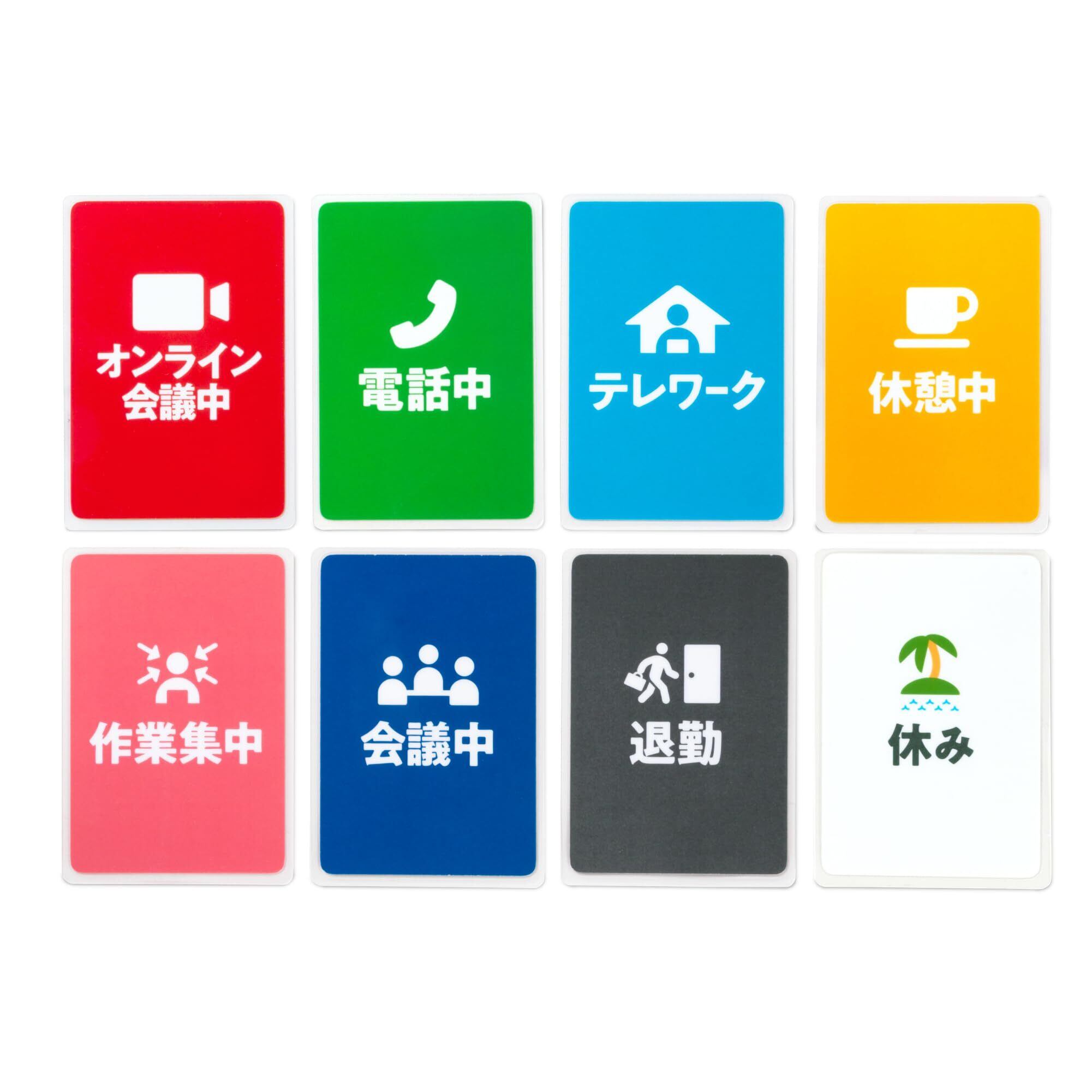 【特価商品】職場のカード (8種セット) 今の状況を周囲にお知らせ 効率化 サインプレート 両面印刷 会議中 休憩中 退勤等 ホルダー付き 厚手ラミネート