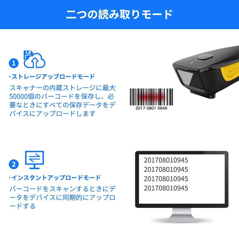 2つのアップロードモード:インスタントアップロードモード+ストレージモード。 スキャナーの内蔵ストレージに最大50000個のバーコードをスキャンして保存し、必要なときにすべての保存データをデバイスにアップロードします。
