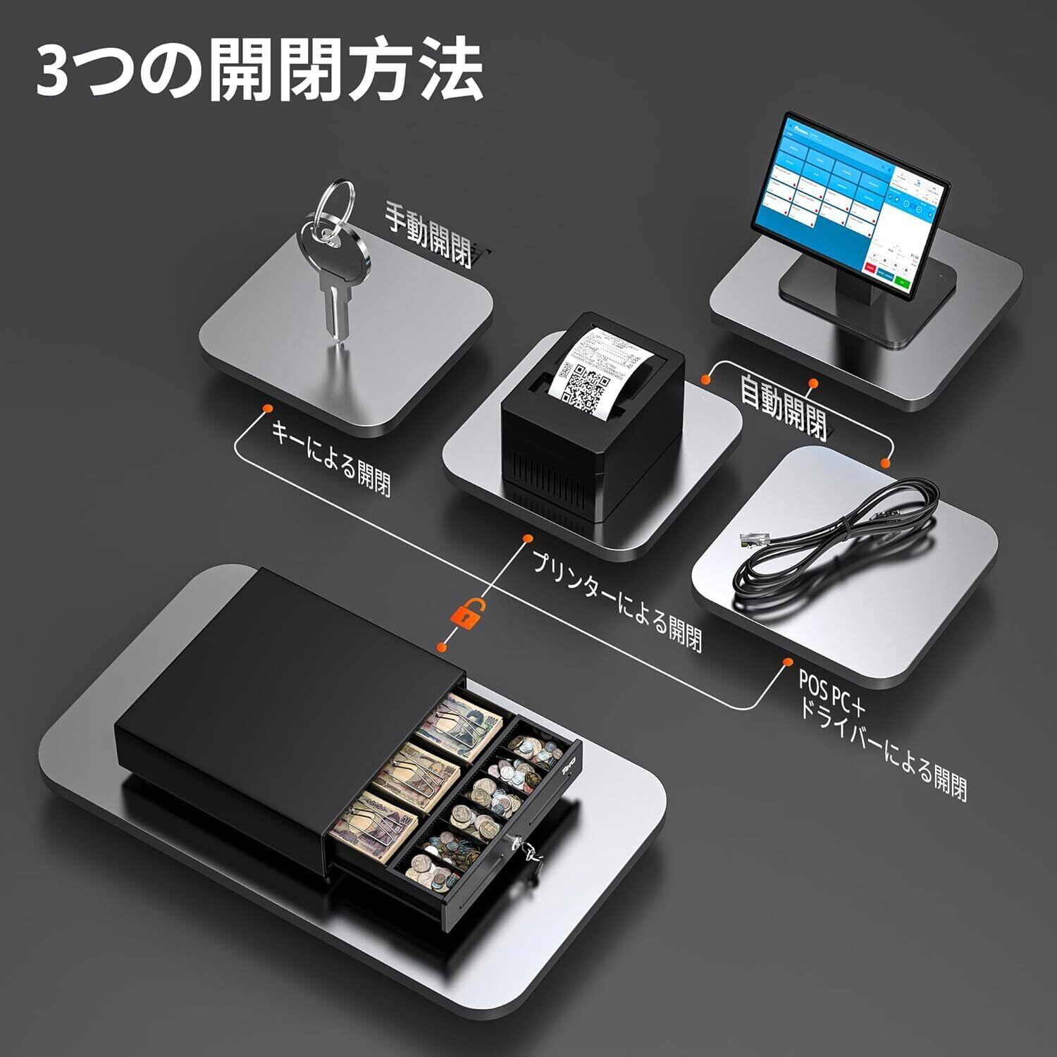 シームレスな接続と多用途性: 付属のRJ12ケーブルを使ってレシートプリンターに簡単に接続でき、POSシステムと連携して自動運用が可能。主要なプリンターブランドに対応しており、小売店やスーパーマーケットなど、家庭用から商業用まで幅広く利用できます。便利な設計で、カウンター上に設置するほか、カウンター下に取り付けることも可能です。