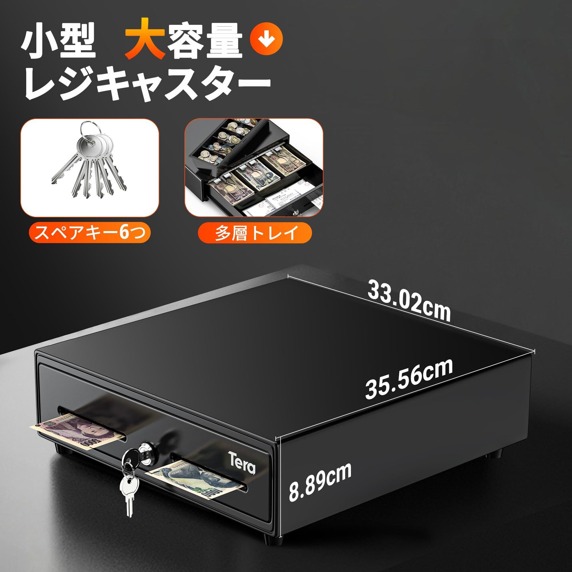 Tera キャッシュドロア 小型 自動開閉+手動開閉 エアレジ対応 POSシステム対応 3紙幣・6硬貨対応トレイ 6本鍵 自動オープン 取り外し可能な硬貨コンパートメント 鍵付きロック 24V RJ12インターフェース 小型ビジネス用 メディアスロット付き